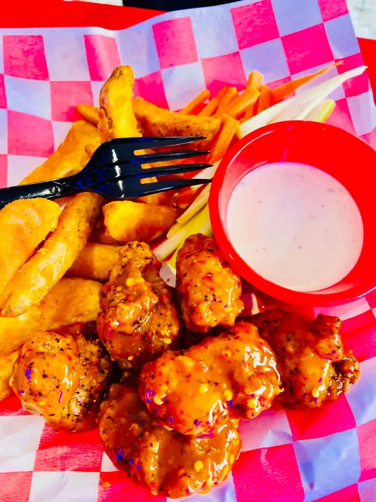 200g de boneless, dedos de queso, 200g de papas a la francesa, aderezo ranch, zanahoria y pepino (2 aderezos)