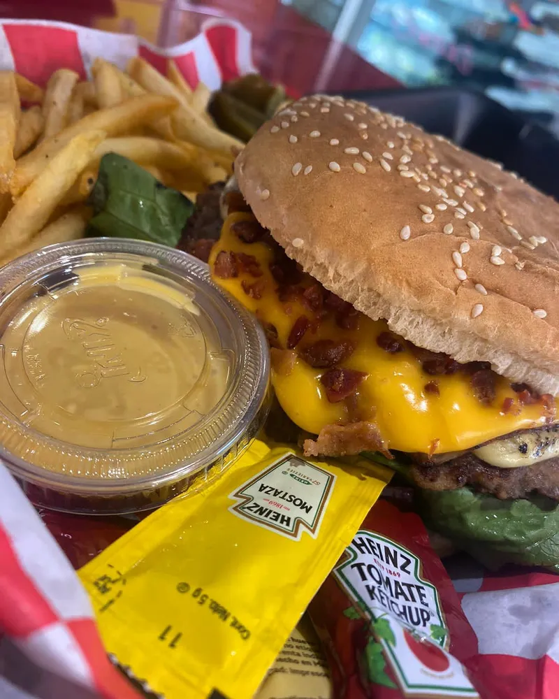 Hamburguesa carne o pollo a a elegir con tocino y queso