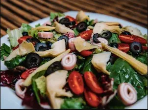 Mezcla de lechugas, tomate cherry, rollitos de jamón con queso, elotitos, alcachofa, aceituna negra y aderezo del chef