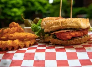 250gr de pechuga de pollo empanizada, bañada en tu salsa preferida, jamón, salami, queso, aguacate, lechuga, tomate, cebolla y acompañada de papas crisscut