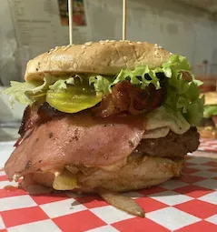 Hamburguesa de res rellena de queso suizo, acompañada de tocino, cebolla caramelizada, jalapeños y pepinillos
