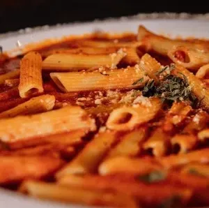 200gr de pasta pluma, jamón, champiñones, queso parmesano y salsa de tomate con la sazón de la casa