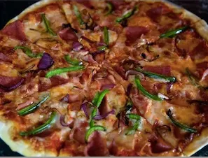 Salami, Jamón, Tocino, Cebolla y Pimiento verde