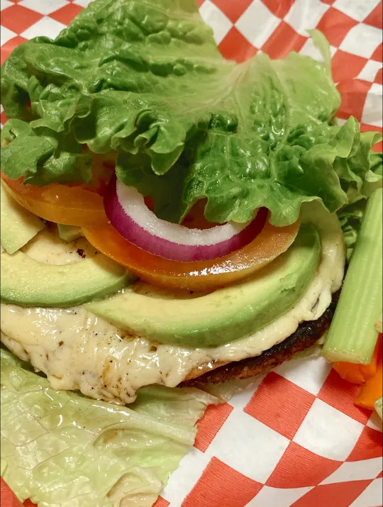 Hamburguesa de carne preparada con queso cheddar o chihuahua, jamón, tomate, cebolla, aguacate, catsup, mayonesa y aderezo chipotle. Envuelta en hoja de lechuga