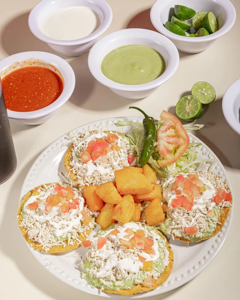 (4pz) De mini tostadas de pollo, guacamole, crema y tomate