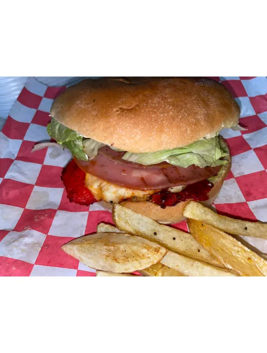 Exquisita hamburguesa de pollo acompañado de papas a la francesa