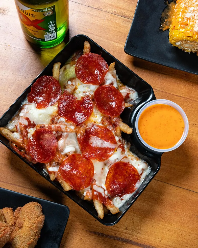 Papas a la francesa bañadas en salsa de tomate estilo ragú, queso mozarella y pepperoni o mexicana