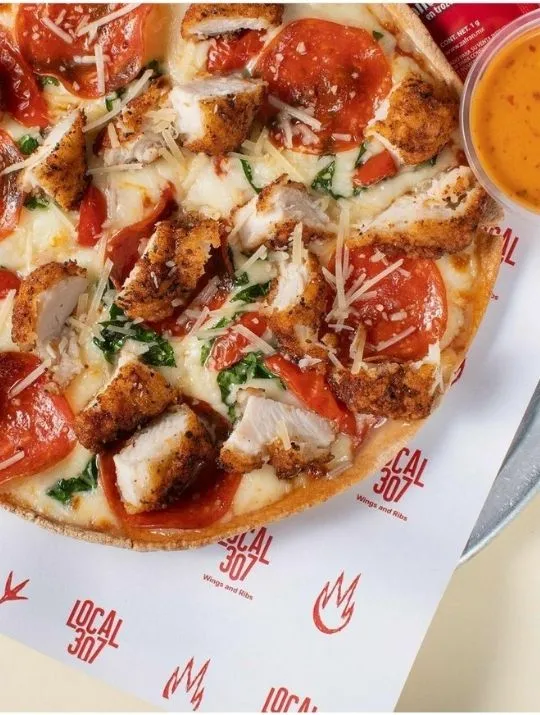 Exquisita pizza casera con queso mozzarella, boneless, espinacas y tomate cherry