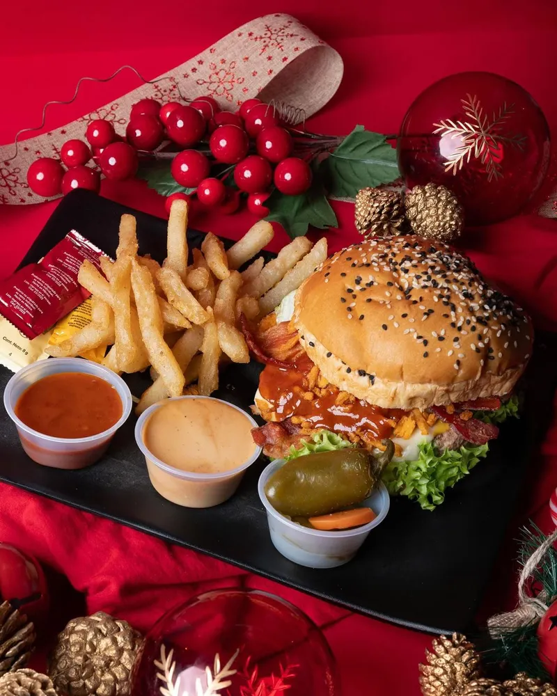 Jugosa carne de res, queso cheddar blanco y amarillo, tocino y crujientes trocitos de cebolla caramelizada, tomate y lechuga