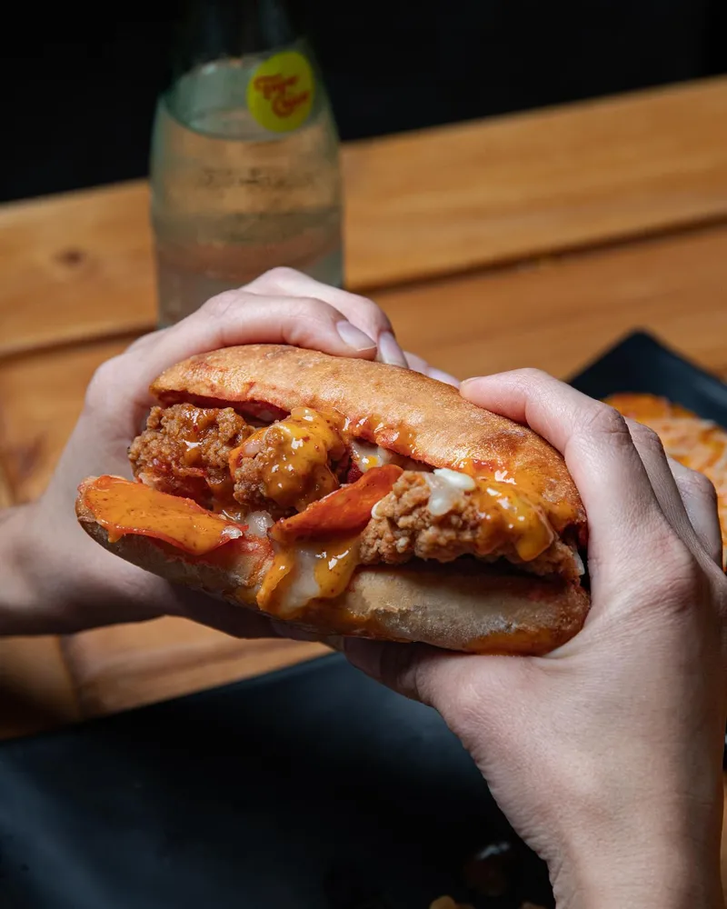 Delicioso sandwich de tenders de pollo con queso mozarella, pepperoni y salsa estilo ragú preparado con pan estilo chapata
