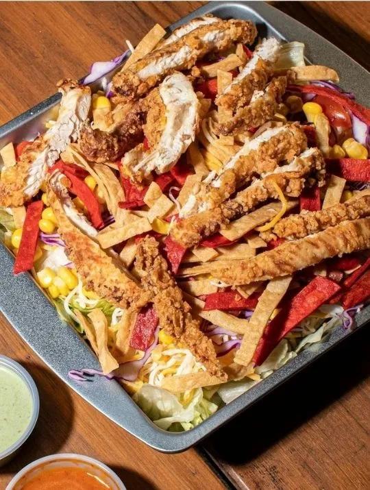Fresca lechuga romana, elote amarillo, tiritas de tortilla crujientes, tomate cherry, mezcla de 4 quesos y fajitas de pollo empanizadas aderezado con nuestro delicioso búfalo ranch o jalape&nti... Read More