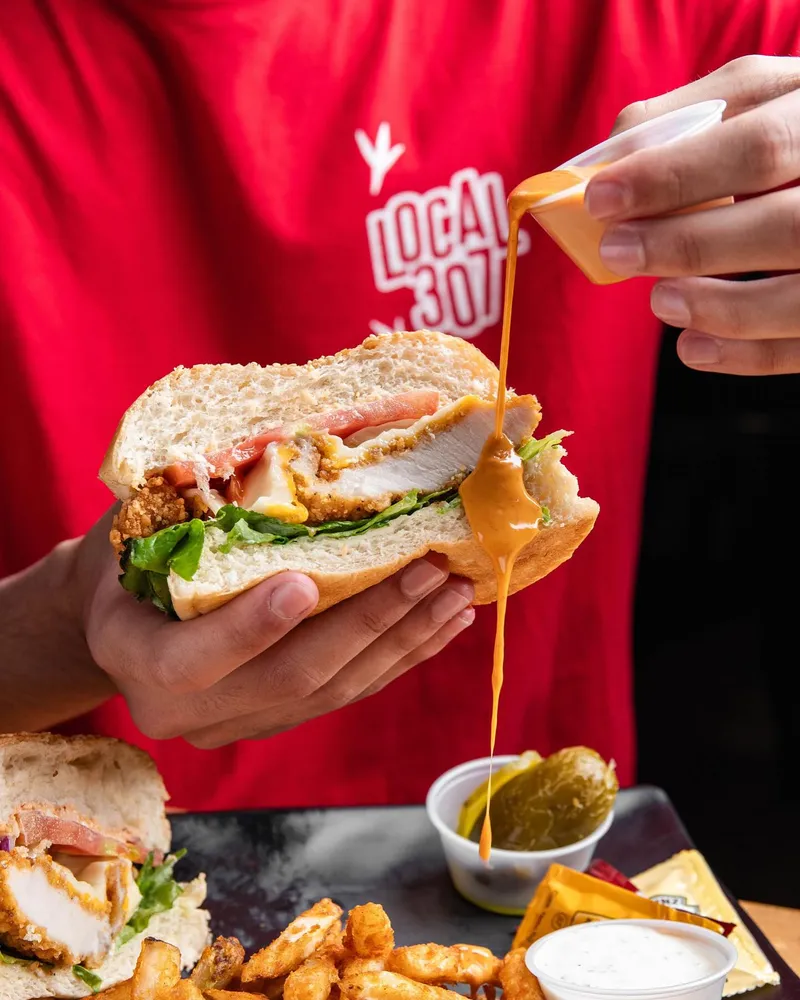 Deliciosa hamburguesa con tenders de pollo empanizados, con papas fritas a un lado