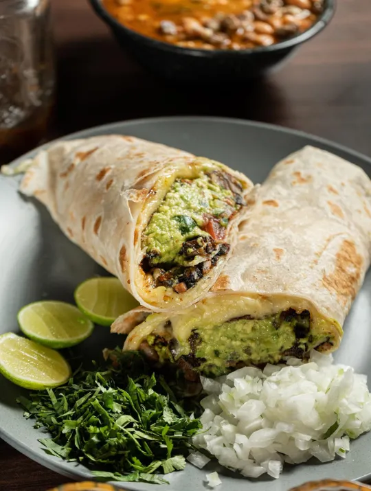 Tortilla de harina de 15" con queso, trompo negro, trompo rojo y guacamole