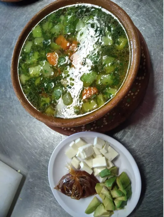 Caldito de pollo con verduras, arroz y pollito acompañado de aguacate, queso y chipotle