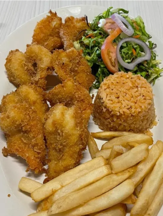 Camarones empanizados, a la diabla o al ajillo acompañado con aros de cebolla, arroz y ensalada