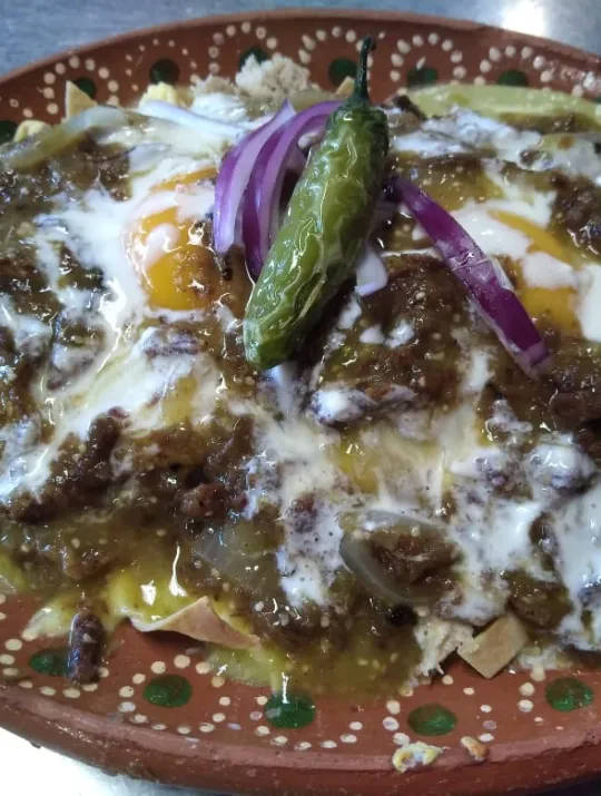 Chilaquiles con salsa verde, pollito, queso gratinado, huevos estrellados y salsa verde con carne seca