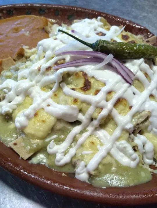 Exquisitos chilaquiles con queso y pollo desmenuzado