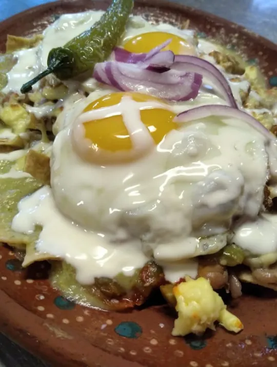 Chilaquiles con salsa verde, nopales, frijolitos de olla y queso gratinado