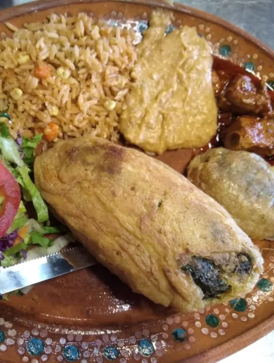 Chile relleno de carne o queso acompañado de un chilito jalapeño relleno de carne o queso, asado o bistec a la mexicana, arroz, frijoles refritos y ensalada