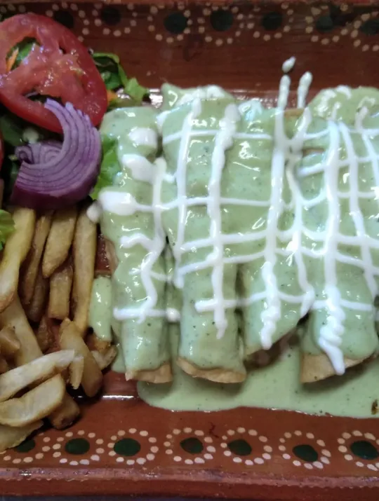 Tortillas rellenas de res o pollo con salsa de aguacate acompañado de ensalada y papitas fritas