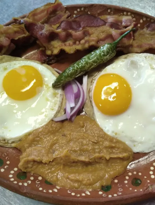 Huevitos revueltos con jamón, tocino, papas, salchicha, mexicana, salsa verde o roja, chile chilaca