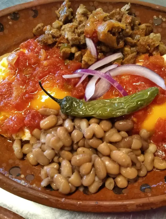Huevitos con salsa mexicana acompañados de bistec a la mexicana y frijoles de olla