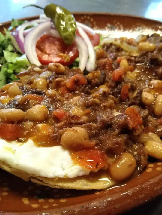 Huevitos con salsa de carne seca con frijolitos de olla acompañados con ensalada