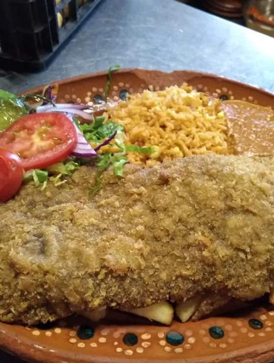 Milanesa de res empanizada acompañada de frijoles refritos, arroz, ensalada y papitas fritas