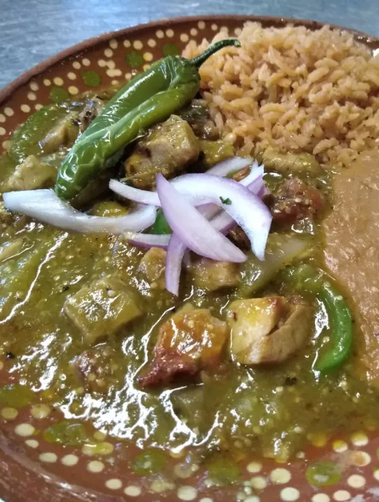 Deliciosa carne de puerco guisada con cebolla y morrón en salsa borde, con un toque de orégano acompañado de frijoles refritos y arroz