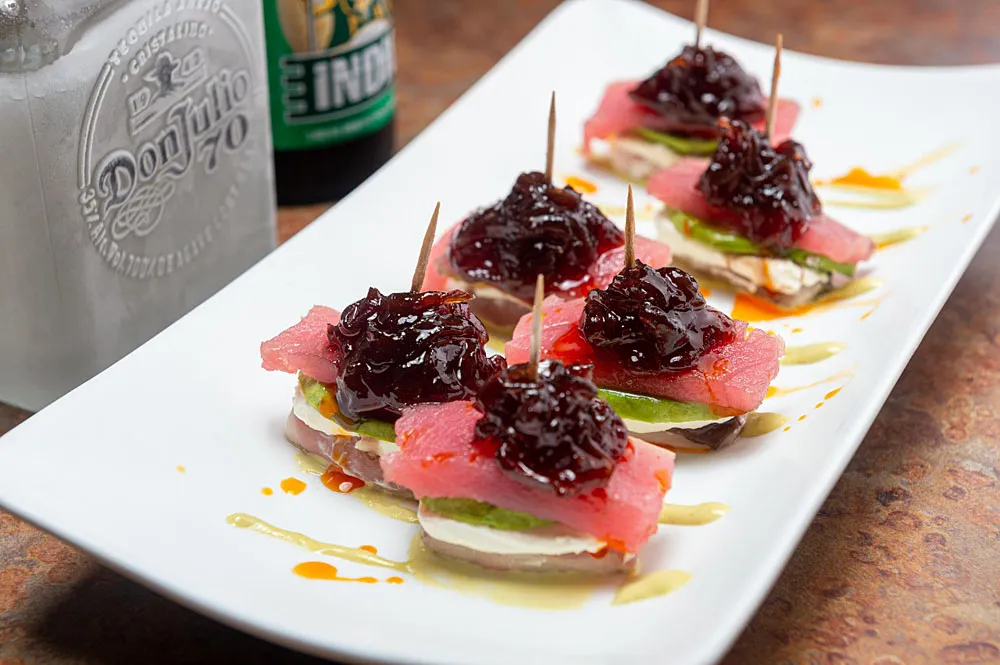 Finos cortes de pulpo, aguacate, queso crema, sashimis de atún y mermelada de cebolla caramelizada