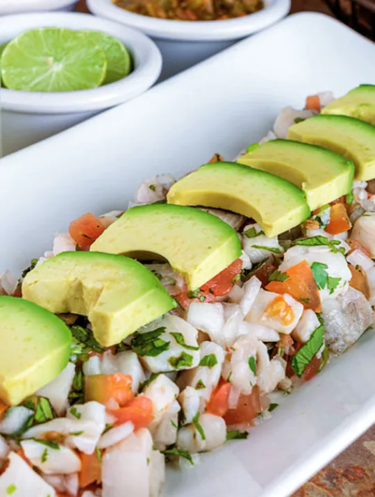 Fresco ceviche de pescado, con pico de gallo, y rebanadas de aguacate