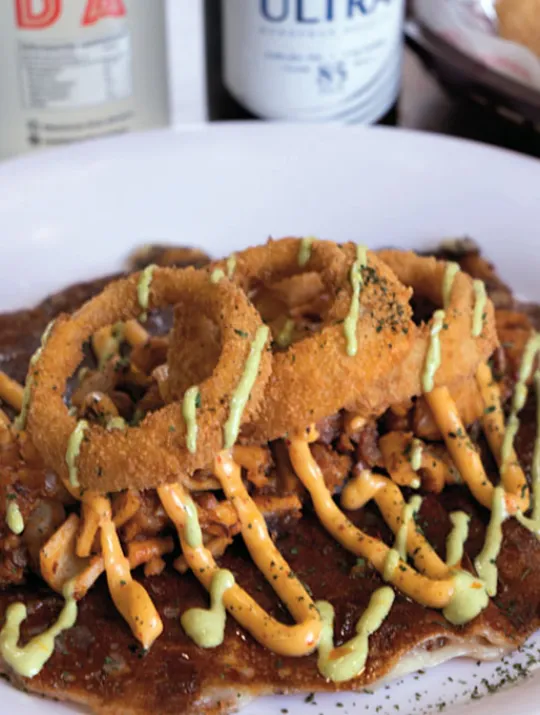 Tortilla de queso a la plancha con mariscada chipotluda, coronado con aros de cebolla