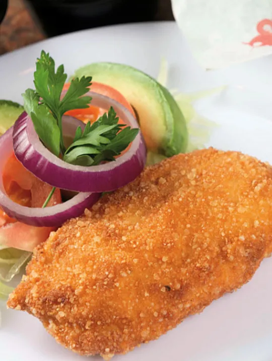 Rellena de queso y jamón empanizada con queso parmesano, acompañada con guarnición keto