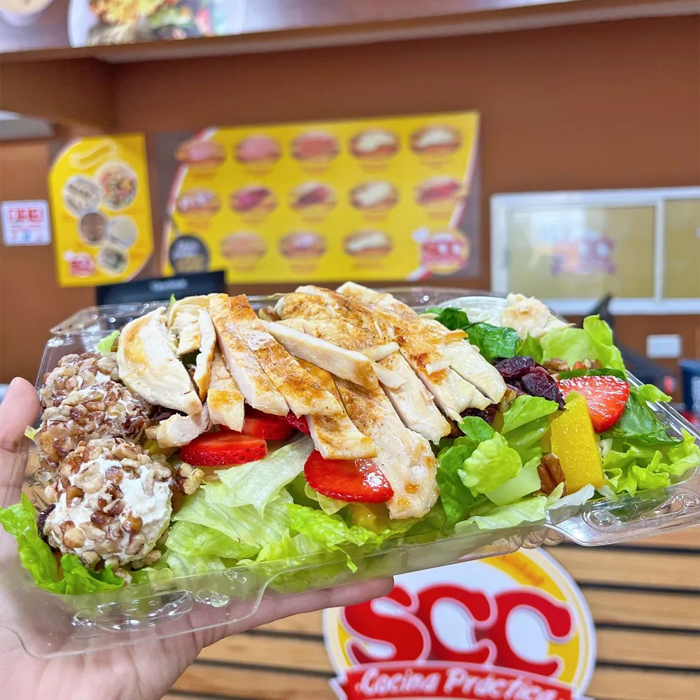 Ensalada de primavera grande con fajitas de pollo