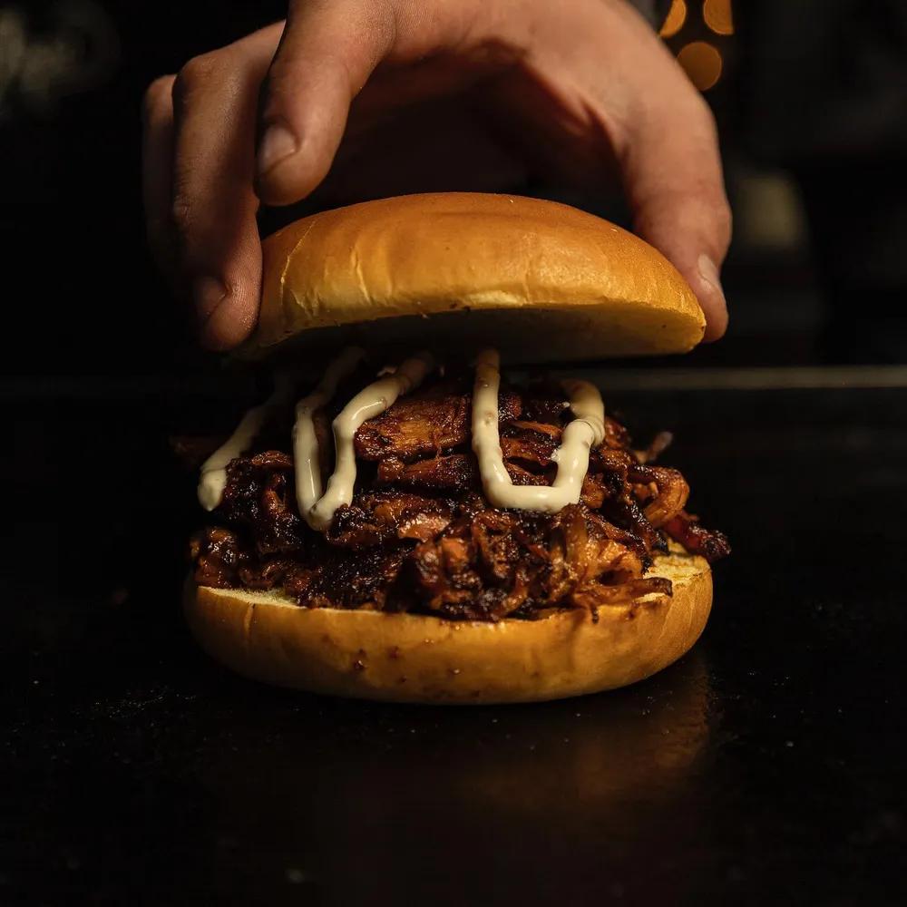Hecha con carne de res, pulled pork, queso gratinado, aderezo de chiles tatemados y cebollitas encurtidas