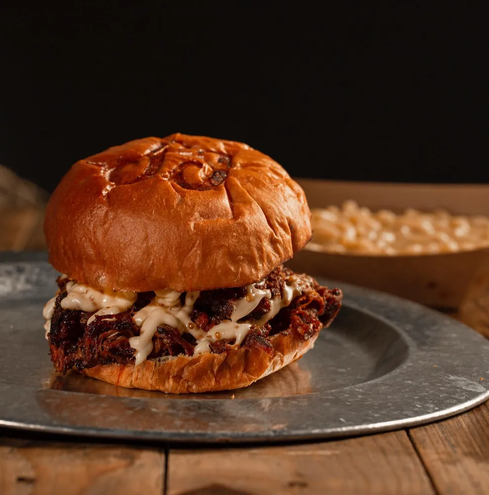 Sandwich de carne de cerdo ahumada desmenuzada, con salsa bbq y mayonesa con mostaza antigua