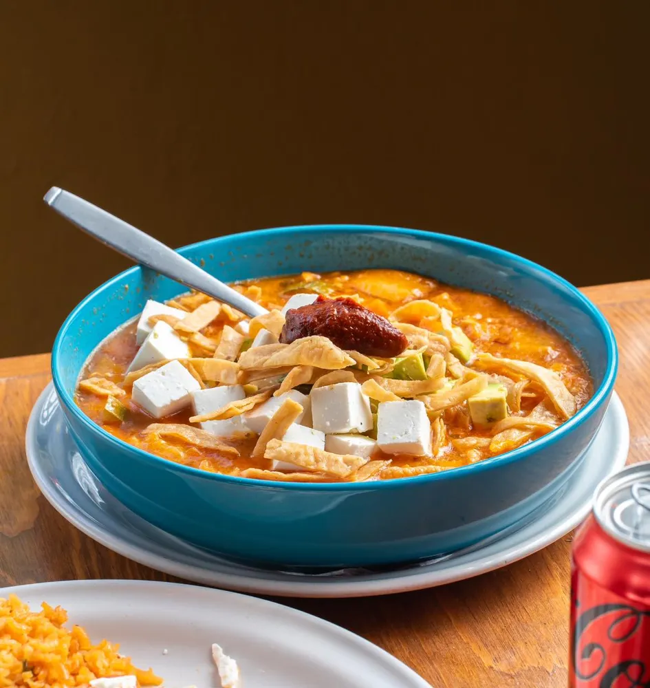 Caldo de pollo con verduras, arroz, aguacate, queso y chipotle, decorado con tortilla frita