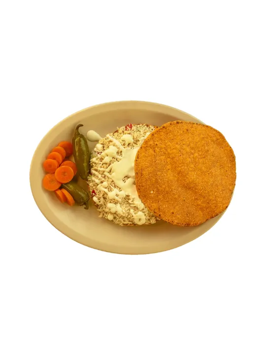 1 tostada con tapa, pechuga de pollo, guacamole , crema , tomate y cebolla