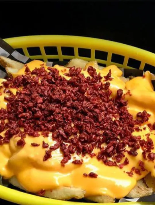 Papas fritas bañadas con queso amarillo y tocino deshidratado