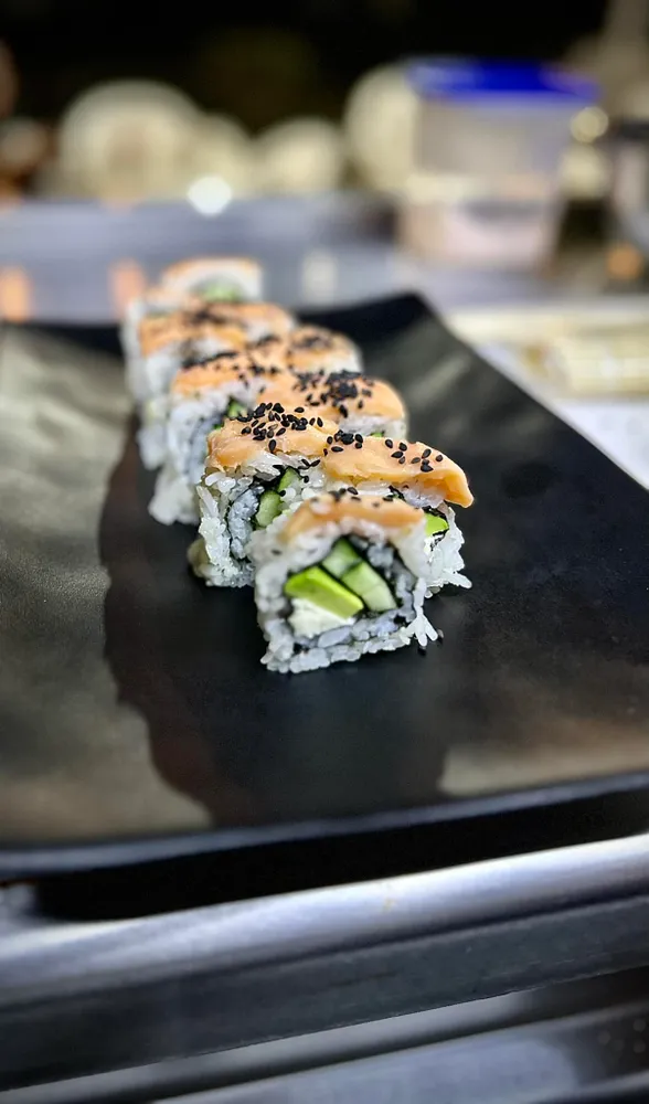 Pepino, queso crema y aguacate. Por fuera: láminas de salmón y ajonjolí negro