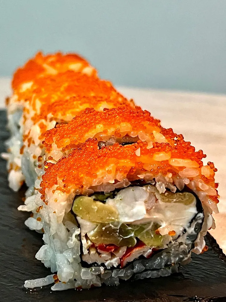 Camarón empanizado, queso crema, surimi y aguacate. Por fuera: masago