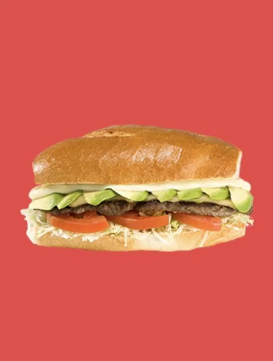 Torta con carne de arrachera, en una cama de lechuga bañada en exquisito queso, acompañada de tus vegetales favoritos, tomate, aguacate y un toque de mayonesa